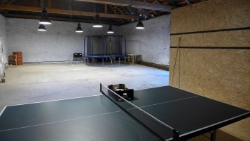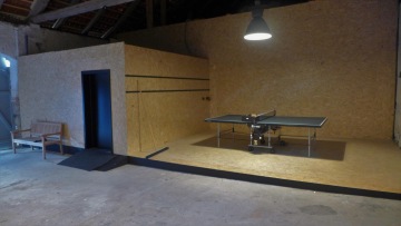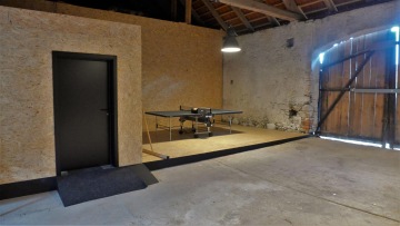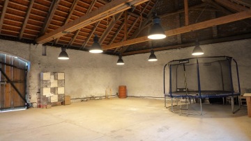 Ve stodole se nachází volný prostor o velikosti 160m², který může sloužit jak pro děti na hraní při nepřízni počasí, tak pro místo pro rauty při svatbách atd. Naleznete zde velkou trampolínu, stůl na stolní tenis, fobálek (provoz zdarma), stojany na kola s možností dobíjení pro elektrokola. Součástí je šatna sloužící jako vstup do cvičebního sálu s čtyřmi wc, sprchou a umyvadlem