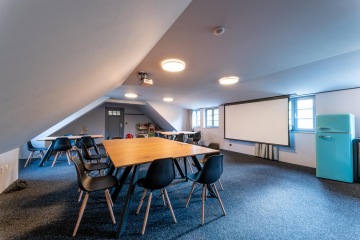 - Konferenční místnost s projektorem, plátnem a kuchyňským koutem.